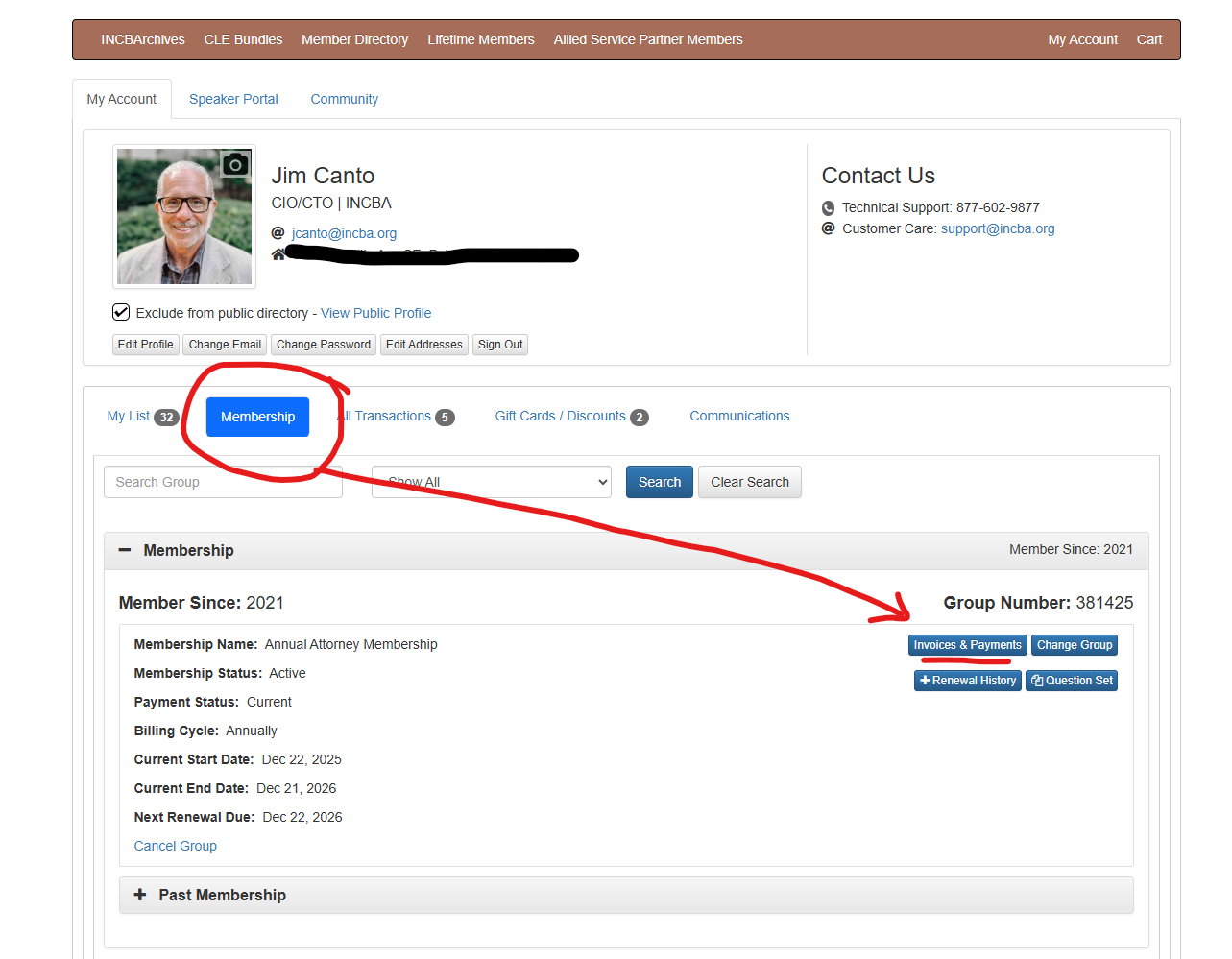 - Once you've accessed your account, click "Membership" tab, and then click the "Invoices & Payments" button.