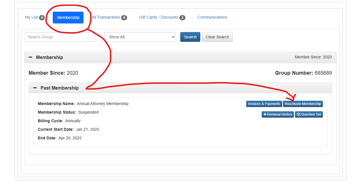 - Click the Reactivate Membership button associated with the membership you wish to reactivate.
