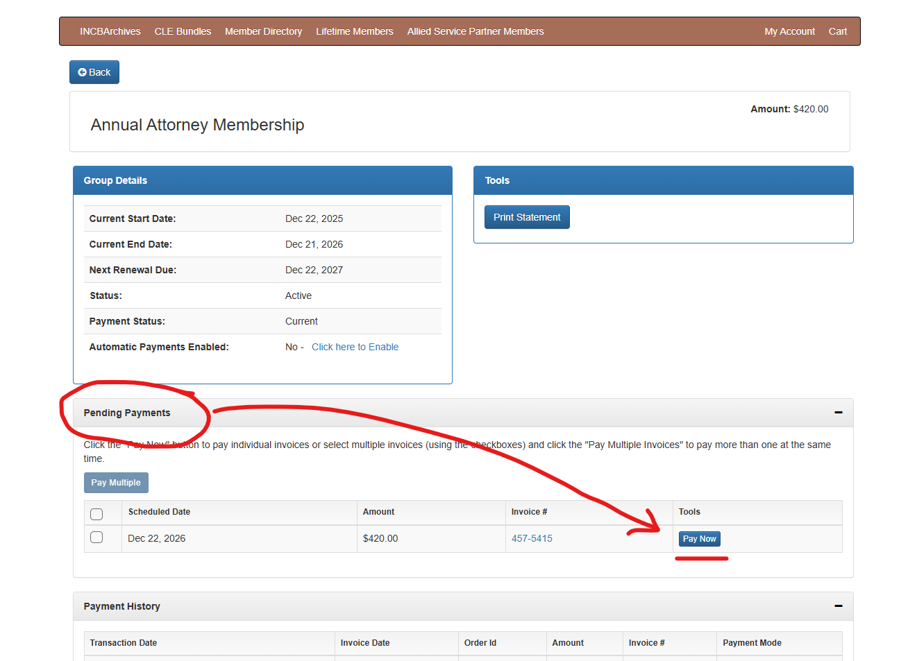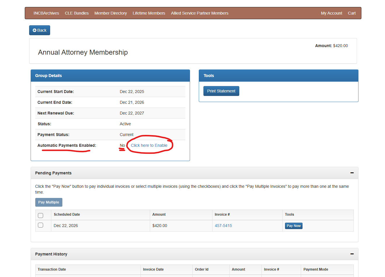 In this document, you will learn where to access the membership payment functionality where you can pay existing invoice(s), setup, authorize, and manage automatic payments, and reactivate previous or suspended memberships.